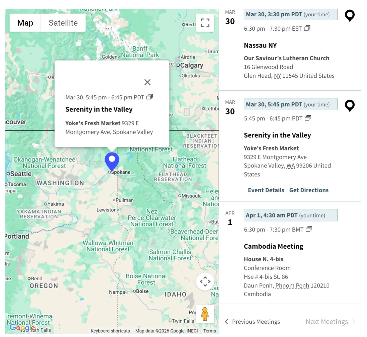 Map View only shows in-person meetings. Click the meeting to highlight the meeting on the and see links for details and directions. A zoomed-in map also appears on the meeting detail page for in-person meetings. There are 12 meetings per page in map view.