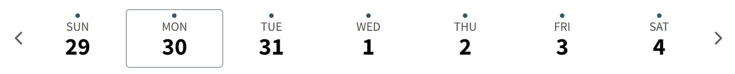 Week view is the fastest way to find meetings on a specific day of the week. Days of the week show across the top from Sunday to Saturday. Days with meetings have a small dot above them. Click on the day to see meetings for that day. Click the arrow on the right to see meetings for the following week.