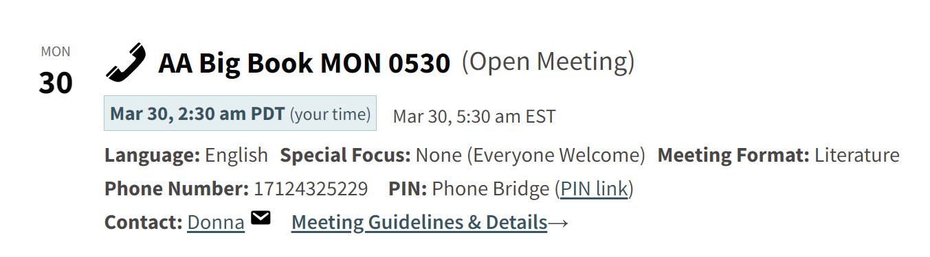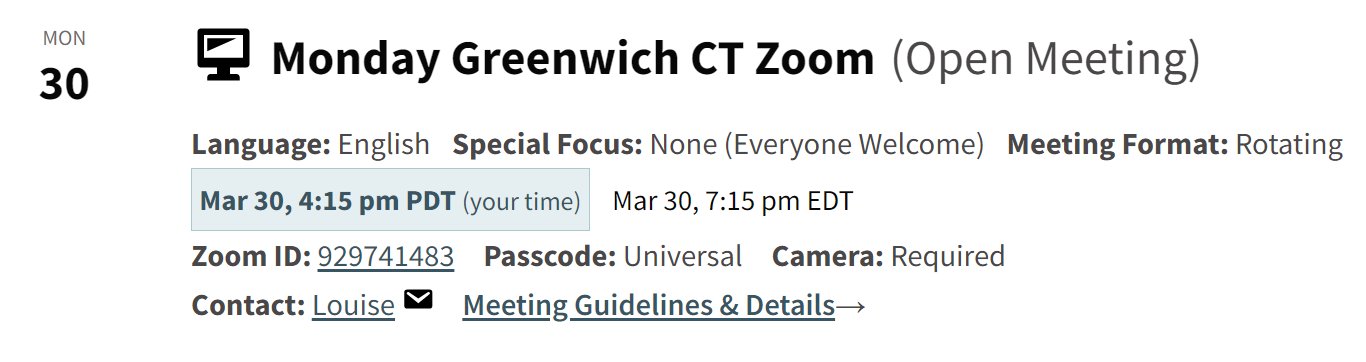 You can see basic information about each meeting in List View, including whether it’s an open or closed meeting, the language, special focus, and format. Phone meetings show the phone number. Zoom meetings show a clickable Zoom ID. In-person meetings show the address. There’s an email link to the contact person and, finally, a link to the page with guidelines and details.